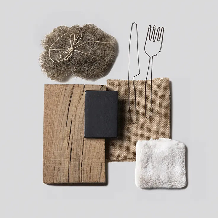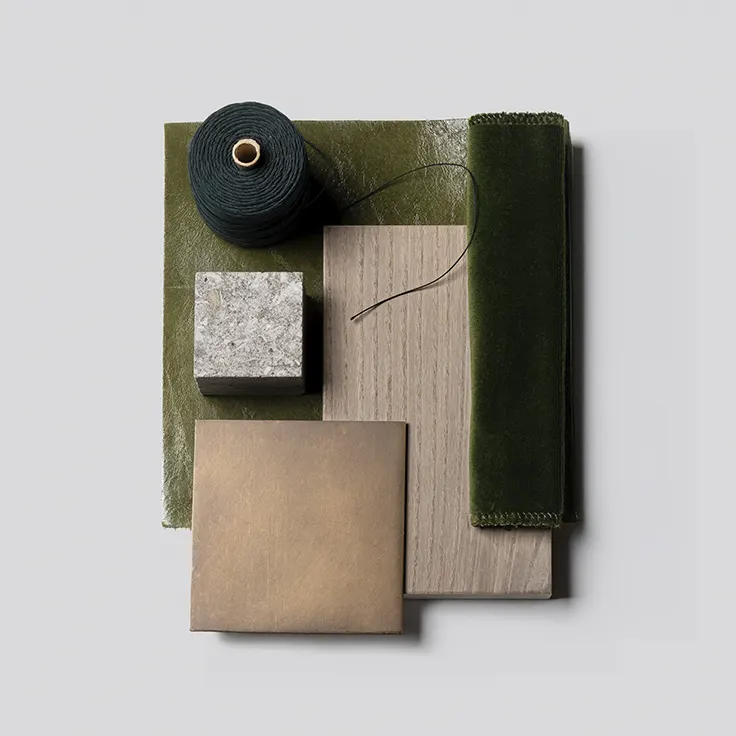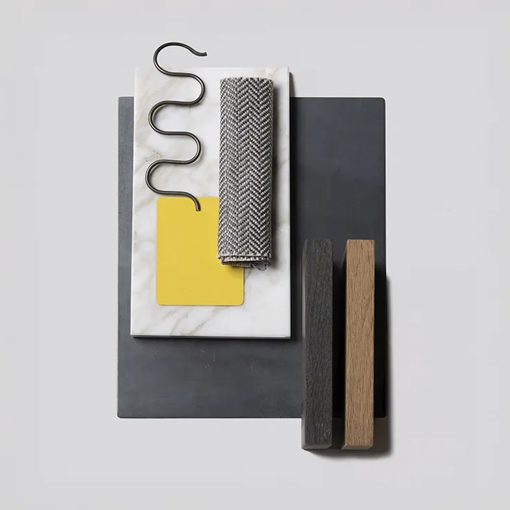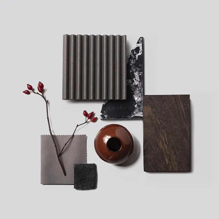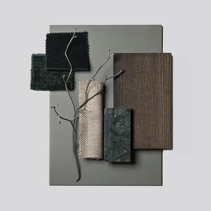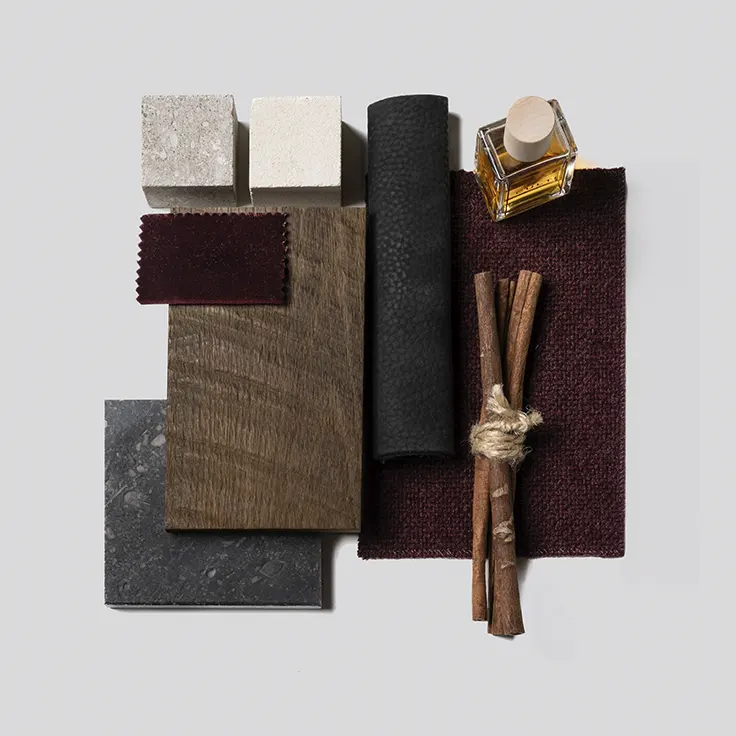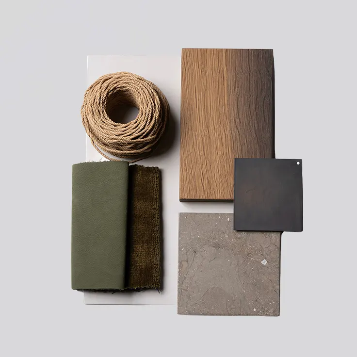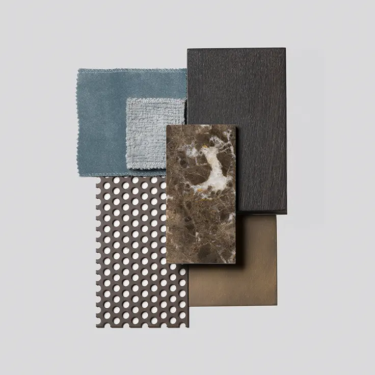 Our moodboards are a collection of visual inspirations, blending fabrics, colors, and materials into harmonious contrasts. Wood, marble, stone, and metal surfaces create exclusive atmospheres, reflecting our artisanal style in every detail.