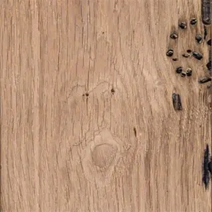 Reclaimed oak, with natural coloring in first patina throughout the mass of a warm brown tone with hazelnut shades, enriched by dark brown streaks.